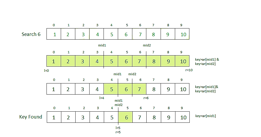 return ternarySearch(mid1 + 1, mid2 - 1, key, ar);
